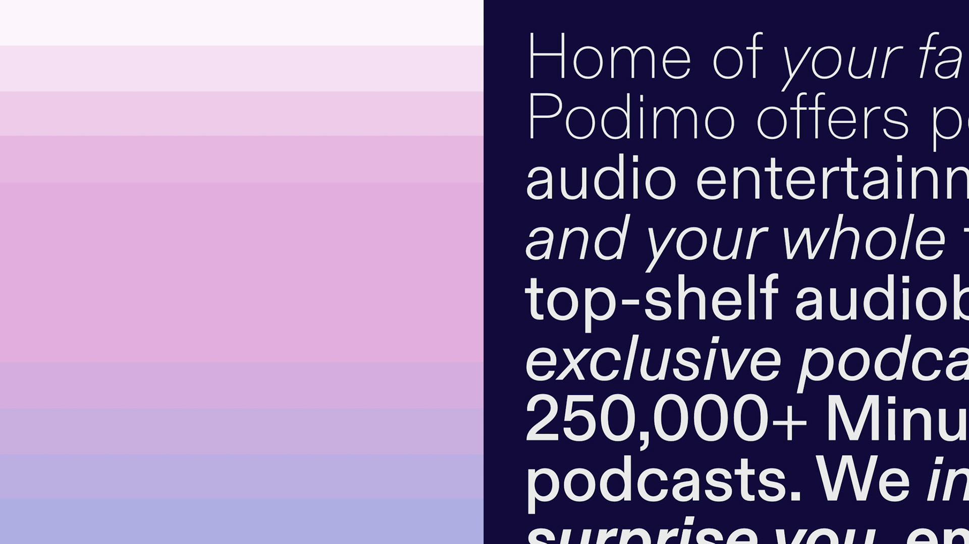 Across the Nordics and North Europe, Podimo has become a go-to destination for high-quality audio content, from podcasts to audiobooks. As their offering expanded and matured – the brand and identity needed to follow suit. Our work focused on refinement and flexibility over total revolution – scalable design systems, refreshed colours, typographic language and a clean, contemporary wordmark. __ Creative strategy, concept, and creative direction.